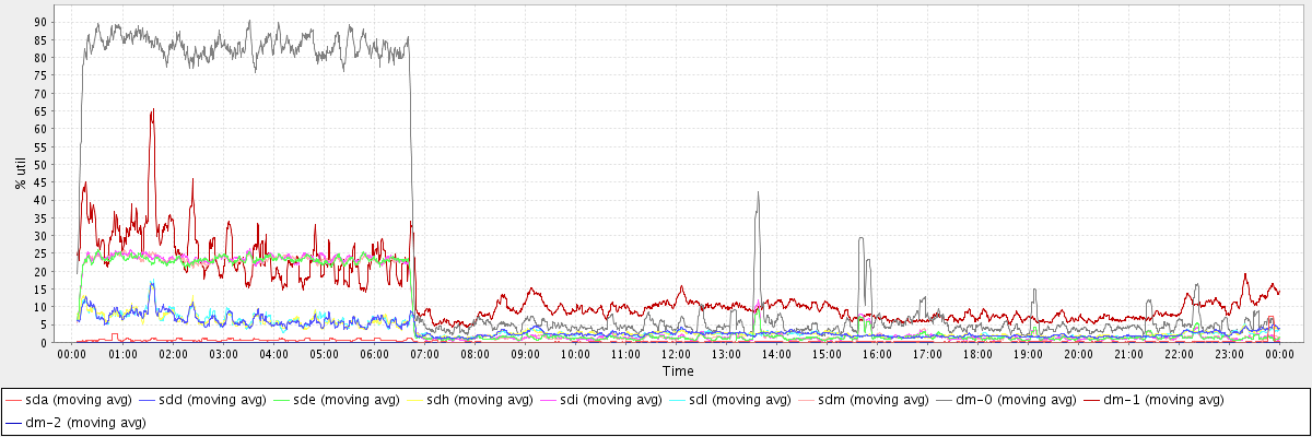 avg(sda) = 0.31 avg(sdd) = 3.48 avg(sde) = 7.46 avg(sdh) = 3.50 avg(sdi) = 7.58 avg(sdl) = 3.50 avg(sdm) = 7.47 avg(dm-0) = 26.82 avg(dm-1) = 13.57 avg(dm-2) = 0.00