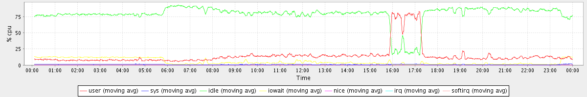 avg(user) = 14.74 avg(sys) = 1.03 avg(idle) = 78.61 avg(iowait) = 5.25 avg(nice) = 0.00 avg(irq) = 0.03 avg(softirq) = 0.34