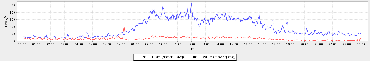 avg(dm-1 read) = 431.93 avg(dm-1 write) = 1036.22