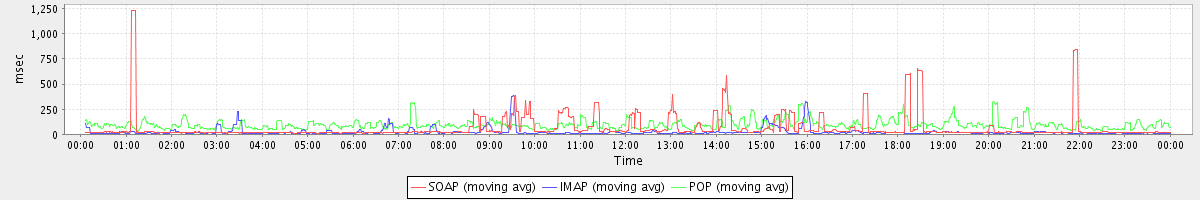 max(MsgActionRequest.move) = 648.00 max(MsgActionRequest.update) = 218.00 max(NoOpRequest) = 284.00 max(GetFolderRequest) = 280.00 max(SyncRequest) = 2709.00 max(GetMsgRequest) = 1443.00 max(GetAppointmentRequest) = 1355.00 max(SearchRequest) = 118.00 max(MsgActionRequest.delete) = 2519.00 max(ItemActionRequest.delete) = 146.00