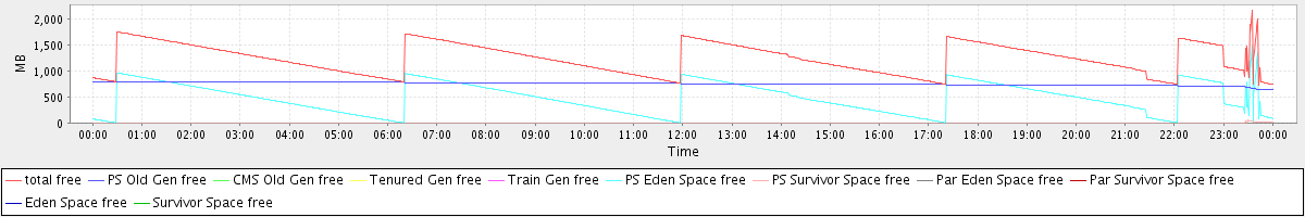avg(total free) = 1242.70 avg(PS Old Gen free) = 754.76 avg(CMS Old Gen free) = 0.00 avg(Tenured Gen free) = 0.00 avg(Train Gen free) = 0.00 avg(PS Eden Space free) = 486.08 avg(PS Survivor Space free) = 1.87 avg(Par Eden Space free) = 0.00 avg(Par Survivor Space free) = 0.00 avg(Eden Space free) = 0.00 avg(Survivor Space free) = 0.00
