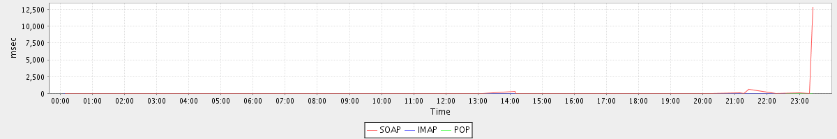 avg(GetInfoRequest) = 995.00 avg(GetFolderRequest) = 63.00 avg(GetDomainInfoRequest) = 2.72 avg(BackupRequest) = 13276.00 avg(DismissCalendarItemAlarmRequest) = 31.00 avg(GetContactsRequest) = 2.00 avg(AuthRequest) = 136.67 avg(SearchRequest) = 20.50