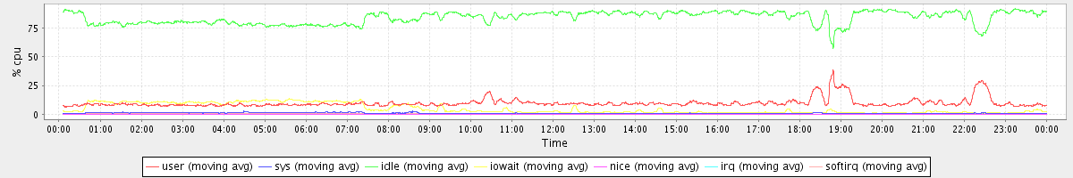 avg(user) = 9.81 avg(sys) = 0.93 avg(idle) = 84.15 avg(iowait) = 4.77 avg(nice) = 0.00 avg(irq) = 0.03 avg(softirq) = 0.32