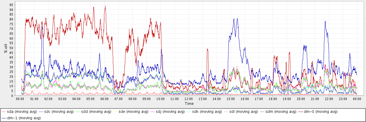 avg(sda) = 1.56 avg(sdc) = 9.55 avg(sdd) = 8.97 avg(sde) = 9.54 avg(sdj) = 8.87 avg(sdk) = 9.52 avg(sdl) = 8.96 avg(sdm) = 9.62 avg(dm-0) = 33.96 avg(dm-1) = 25.45