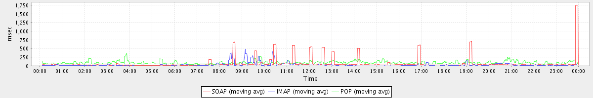 avg(SyncGalRequest) = 4861.01 avg(GetFreeBusyRequest) = 530.98 avg(BrowseRequest) = 542.00 avg(SearchGalRequest) = 417.27 avg(BackupRequest) = 16599.50 avg(FolderActionRequest.empty) = 2569.67 avg(SendInviteReplyRequest) = 592.35 avg(GetQuotaUsageRequest) = 3367.00 avg(ContactActionRequest.delete) = 587.00 avg(ConvActionRequest.delete) = 579.93