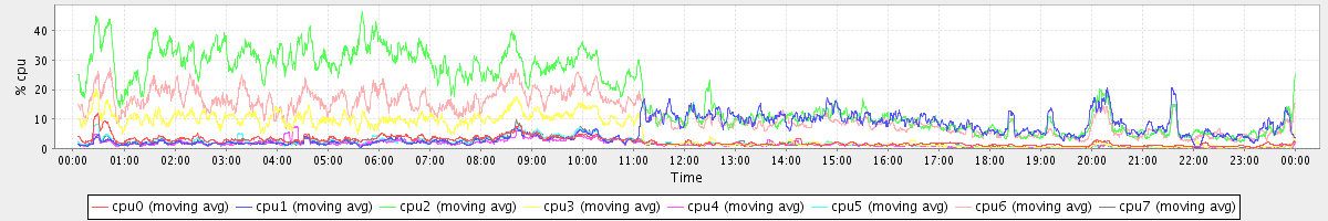 avg(cpu0) = 2.38 avg(cpu1) = 5.83 avg(cpu2) = 18.33 avg(cpu3) = 5.39 avg(cpu4) = 1.46 avg(cpu5) = 1.83 avg(cpu6) = 11.75 avg(cpu7) = 1.74