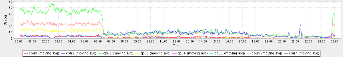 avg(cpu0) = 1.73 avg(cpu1) = 0.24 avg(cpu2) = 0.31 avg(cpu3) = 0.20 avg(cpu4) = 0.13 avg(cpu5) = 0.16 avg(cpu6) = 0.24 avg(cpu7) = 0.15