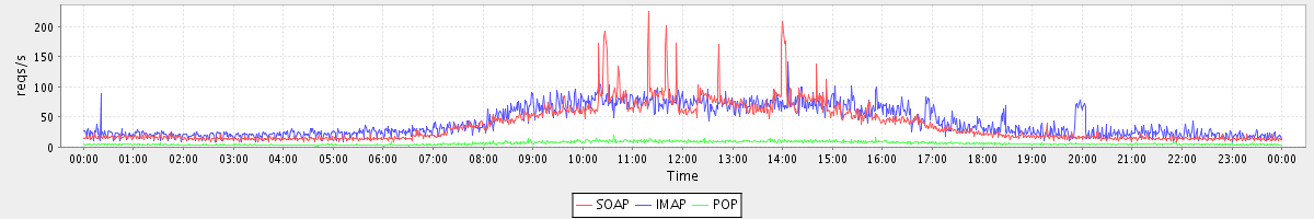 Host zm04.stanford.edu: Mailboxd: Request Rate by Client Protocol