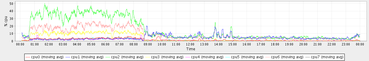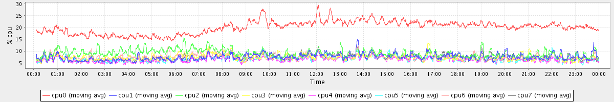 avg(cpu0) = 20.01 avg(cpu1) = 7.47 avg(cpu2) = 9.05 avg(cpu3) = 7.36 avg(cpu4) = 6.35 avg(cpu5) = 6.73 avg(cpu6) = 7.45 avg(cpu7) = 7.36