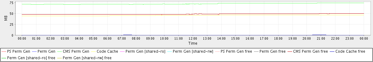 avg(PS Perm Gen) = 0.00 avg(Perm Gen) = 0.00 avg(CMS Perm Gen) = 72.67 avg(Code Cache) = 45.81 avg(Perm Gen [shared-ro]) = 0.00 avg(Perm Gen [shared-rw]) = 0.00 avg(PS Perm Gen free) = 0.00 avg(Perm Gen free) = 0.00 avg(CMS Perm Gen free) = 48.73 avg(Code Cache free) = 0.13 avg(Perm Gen [shared-ro] free) = 0.00 avg(Perm Gen [shared-rw] free) = 0.00