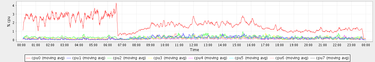 avg(cpu0) = 1.76 avg(cpu1) = 0.21 avg(cpu2) = 0.29 avg(cpu3) = 0.18 avg(cpu4) = 0.10 avg(cpu5) = 0.13 avg(cpu6) = 0.21 avg(cpu7) = 0.12