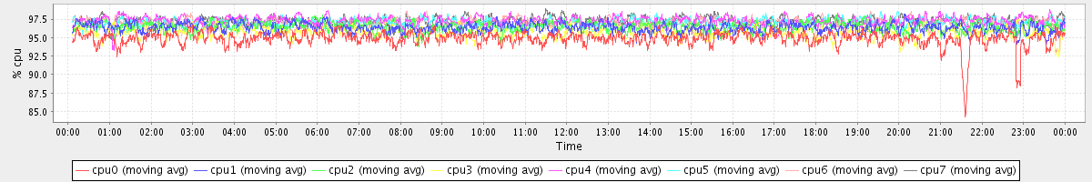 avg(cpu0) = 94.88 avg(cpu1) = 96.38 avg(cpu2) = 96.45 avg(cpu3) = 95.79 avg(cpu4) = 97.22 avg(cpu5) = 97.03 avg(cpu6) = 96.95 avg(cpu7) = 97.22