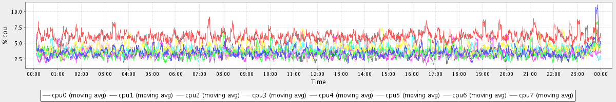 avg(cpu0) = 0.56 avg(cpu1) = 0.45 avg(cpu2) = 0.33 avg(cpu3) = 0.33 avg(cpu4) = 0.25 avg(cpu5) = 0.23 avg(cpu6) = 0.22 avg(cpu7) = 0.16