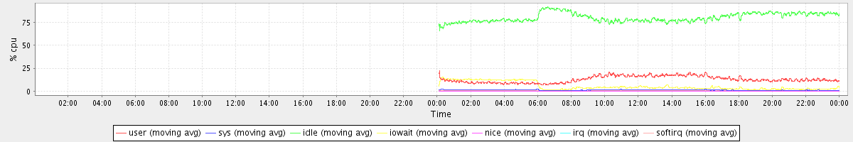avg(user) = 12.82 avg(sys) = 1.23 avg(idle) = 80.10 avg(iowait) = 5.43 avg(nice) = 0.00 avg(irq) = 0.04 avg(softirq) = 0.37