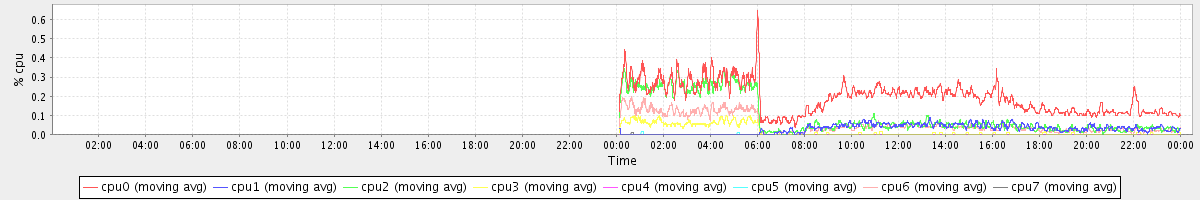 avg(cpu0) = 1.74 avg(cpu1) = 0.20 avg(cpu2) = 0.29 avg(cpu3) = 0.16 avg(cpu4) = 0.11 avg(cpu5) = 0.13 avg(cpu6) = 0.19 avg(cpu7) = 0.12