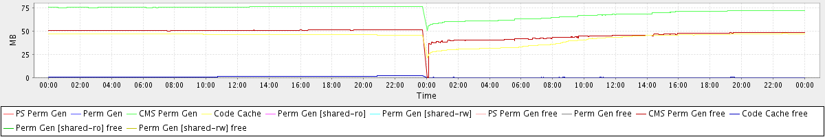 avg(PS Perm Gen) = 0.00 avg(Perm Gen) = 0.00 avg(CMS Perm Gen) = 71.60 avg(Code Cache) = 43.45 avg(Perm Gen [shared-ro]) = 0.00 avg(Perm Gen [shared-rw]) = 0.00 avg(PS Perm Gen free) = 0.00 avg(Perm Gen free) = 0.00 avg(CMS Perm Gen free) = 47.72 avg(Code Cache free) = 0.64 avg(Perm Gen [shared-ro] free) = 0.00 avg(Perm Gen [shared-rw] free) = 0.00