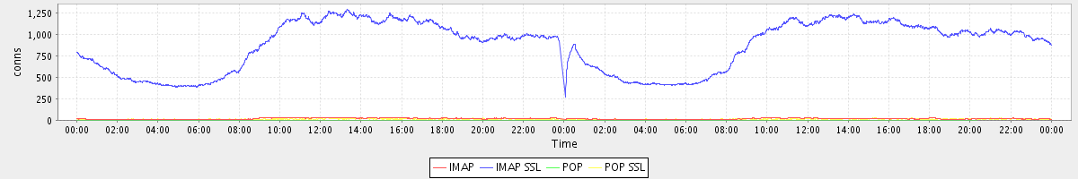 avg(IMAP) = 17.33 avg(IMAP SSL) = 875.14 avg(POP) = 0.27 avg(POP SSL) = 13.17