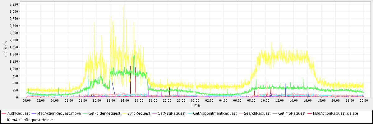 avg(SyncGalRequest) = 5071.97 avg(GetFreeBusyRequest) = 527.32 avg(FolderActionRequest.delete) = 1468.06 avg(DeleteAccountRequest) = 2963.00 avg(BackupRequest) = 17072.00 avg(FolderActionRequest.empty) = 1600.66 avg(FolderActionRequest.sync) = 8159.00 avg(BackupQueryRequest) = 414.86 avg(GetQuotaUsageRequest) = 3671.00 avg(ConvActionRequest.delete) = 461.92