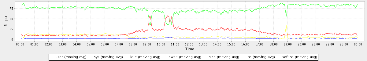 avg(user) = 16.19 avg(sys) = 1.74 avg(idle) = 74.52 avg(iowait) = 6.88 avg(nice) = 0.00 avg(irq) = 0.06 avg(softirq) = 0.62