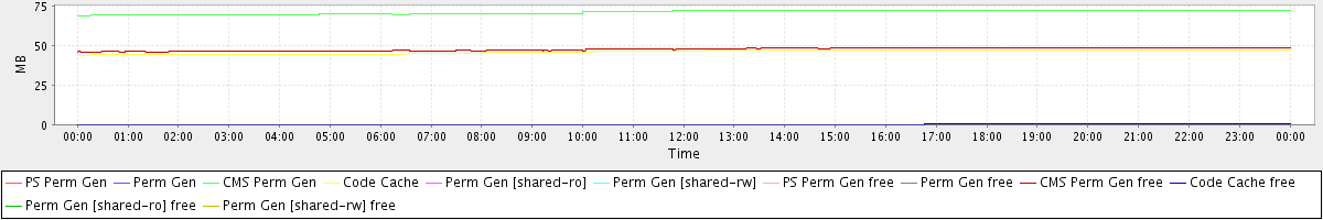 avg(PS Perm Gen) = 0.00 avg(Perm Gen) = 0.00 avg(CMS Perm Gen) = 71.34 avg(Code Cache) = 46.23 avg(Perm Gen [shared-ro]) = 0.00 avg(Perm Gen [shared-rw]) = 0.00 avg(PS Perm Gen free) = 0.00 avg(Perm Gen free) = 0.00 avg(CMS Perm Gen free) = 47.71 avg(Code Cache free) = 0.16 avg(Perm Gen [shared-ro] free) = 0.00 avg(Perm Gen [shared-rw] free) = 0.00
