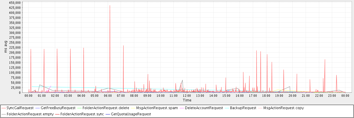 avg(SyncGalRequest) = 6797.45 avg(GetFreeBusyRequest) = 590.81 avg(FolderActionRequest.delete) = 669.91 avg(MsgActionRequest.spam) = 589.83 avg(DeleteAccountRequest) = 14249.25 avg(BackupRequest) = 15161.00 avg(MsgActionRequest.copy) = 1985.00 avg(FolderActionRequest.empty) = 3811.62 avg(FolderActionRequest.sync) = 5944.00 avg(GetQuotaUsageRequest) = 3655.00