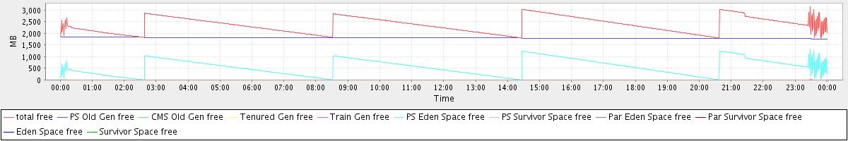 avg(total free) = 2360.88 avg(PS Old Gen free) = 1805.02 avg(CMS Old Gen free) = 0.00 avg(Tenured Gen free) = 0.00 avg(Train Gen free) = 0.00 avg(PS Eden Space free) = 553.51 avg(PS Survivor Space free) = 2.35 avg(Par Eden Space free) = 0.00 avg(Par Survivor Space free) = 0.00 avg(Eden Space free) = 0.00 avg(Survivor Space free) = 0.00