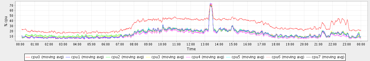 avg(cpu0) = 2.44 avg(cpu1) = 0.43 avg(cpu2) = 0.48 avg(cpu3) = 0.38 avg(cpu4) = 0.26 avg(cpu5) = 0.35 avg(cpu6) = 0.40 avg(cpu7) = 0.35