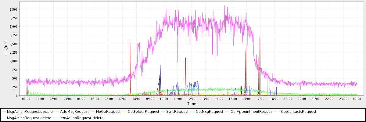 max(MsgActionRequest.update) = 1704.00 max(AddMsgRequest) = 411.00 max(NoOpRequest) = 246.00 max(GetFolderRequest) = 200.00 max(SyncRequest) = 2601.00 max(GetMsgRequest) = 305.00 max(GetAppointmentRequest) = 282.00 max(GetContactsRequest) = 764.00 max(MsgActionRequest.delete) = 1561.00 max(ItemActionRequest.delete) = 874.00