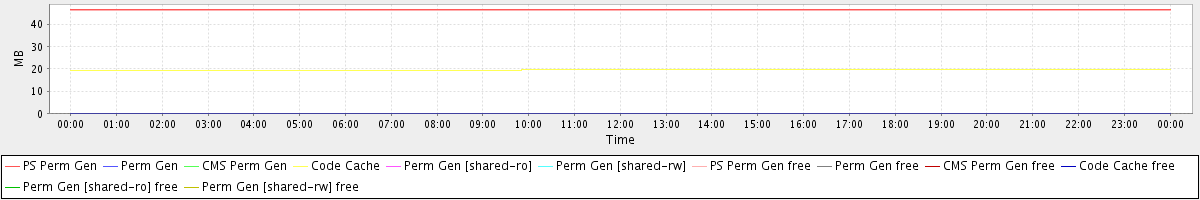 avg(PS Perm Gen) = 46.64 avg(Perm Gen) = 0.00 avg(CMS Perm Gen) = 0.00 avg(Code Cache) = 19.45 avg(Perm Gen [shared-ro]) = 0.00 avg(Perm Gen [shared-rw]) = 0.00 avg(PS Perm Gen free) = 46.18 avg(Perm Gen free) = 0.00 avg(CMS Perm Gen free) = 0.00 avg(Code Cache free) = 0.06 avg(Perm Gen [shared-ro] free) = 0.00 avg(Perm Gen [shared-rw] free) = 0.00