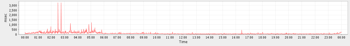 avg(SyncGalRequest) = 7623.08 avg(BackupQueryRequest) = 4205.00 avg(GetFreeBusyRequest) = 527.91 avg(FolderActionRequest.delete) = 1036.17 avg(MaintainTablesRequest) = 237260.00 avg(GetQuotaUsageRequest) = 3632.00 avg(ConvActionRequest.delete) = 318.29 avg(BackupRequest) = 16662.00 avg(FolderActionRequest.empty) = 2678.79 avg(FolderActionRequest.sync) = 1614.50