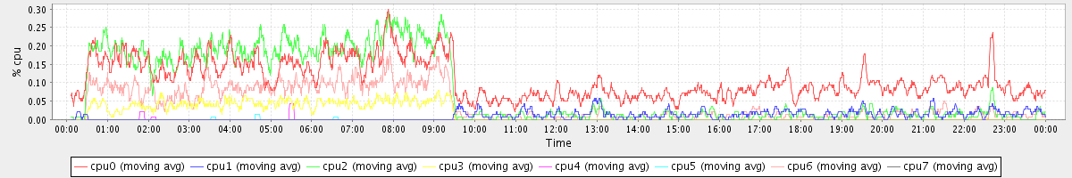 avg(cpu0) = 1.68 avg(cpu1) = 0.18 avg(cpu2) = 0.25 avg(cpu3) = 0.17 avg(cpu4) = 0.12 avg(cpu5) = 0.14 avg(cpu6) = 0.18 avg(cpu7) = 0.12