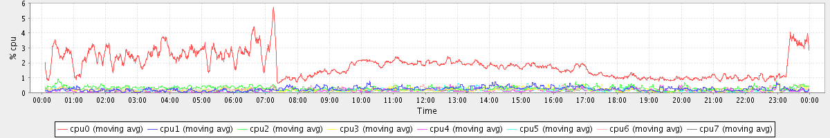 avg(cpu0) = 1.85 avg(cpu1) = 0.24 avg(cpu2) = 0.31 avg(cpu3) = 0.19 avg(cpu4) = 0.14 avg(cpu5) = 0.16 avg(cpu6) = 0.24 avg(cpu7) = 0.13