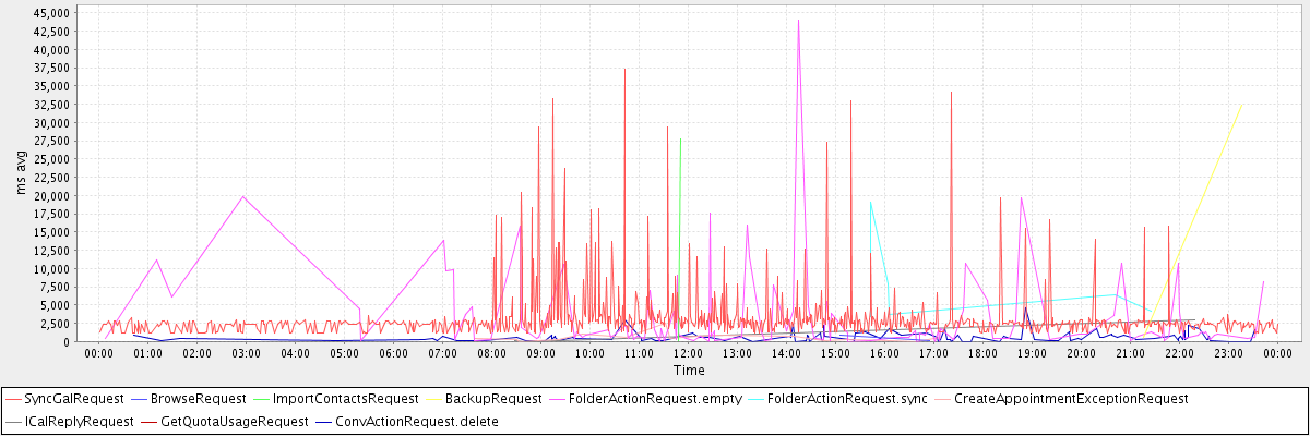 avg(SyncGalRequest) = 3200.88 avg(BrowseRequest) = 561.00 avg(ImportContactsRequest) = 13927.50 avg(BackupRequest) = 16450.50 avg(FolderActionRequest.empty) = 3237.89 avg(FolderActionRequest.sync) = 7437.67 avg(CreateAppointmentExceptionRequest) = 604.94 avg(ICalReplyRequest) = 1025.33 avg(GetQuotaUsageRequest) = 3508.00 avg(ConvActionRequest.delete) = 591.39