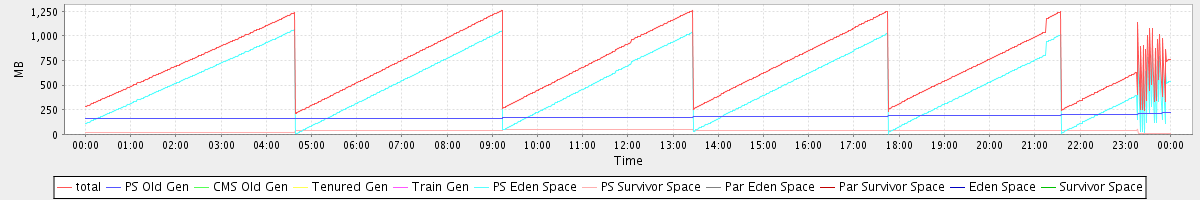avg(total) = 720.65 avg(PS Old Gen) = 176.57 avg(CMS Old Gen) = 0.00 avg(Tenured Gen) = 0.00 avg(Train Gen) = 0.00 avg(PS Eden Space) = 506.66 avg(PS Survivor Space) = 37.43 avg(Par Eden Space) = 0.00 avg(Par Survivor Space) = 0.00 avg(Eden Space) = 0.00 avg(Survivor Space) = 0.00