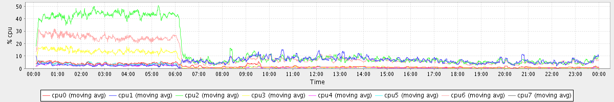 avg(cpu0) = 1.97 avg(cpu1) = 5.72 avg(cpu2) = 15.97 avg(cpu3) = 4.15 avg(cpu4) = 1.03 avg(cpu5) = 1.40 avg(cpu6) = 10.65 avg(cpu7) = 1.33