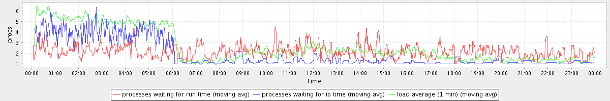 avg(processes waiting for run time) = 1.27 avg(processes waiting for io time) = 1.12 avg(load average (1 min)) = 2.60