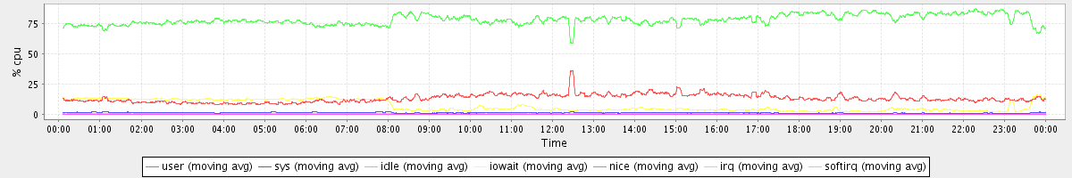 avg(user) = 13.20 avg(sys) = 1.26 avg(idle) = 78.17 avg(iowait) = 6.92 avg(nice) = 0.00 avg(irq) = 0.04 avg(softirq) = 0.41