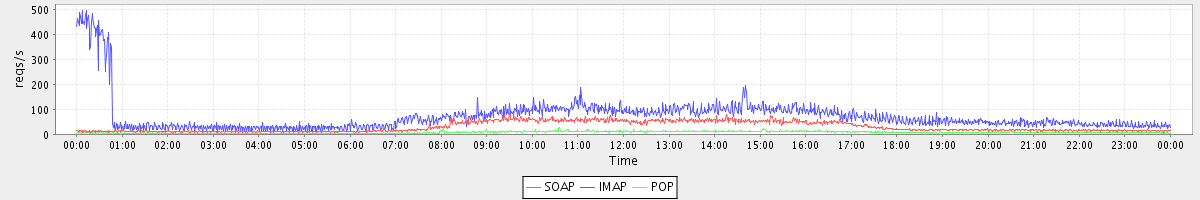 Host zm08.stanford.edu: Mailboxd: Request Rate by Client Protocol
