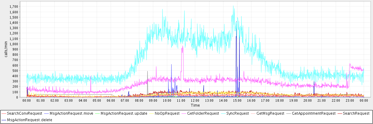 max(SearchConvRequest) = 90.00 max(MsgActionRequest.move) = 616.00 max(MsgActionRequest.update) = 80.00 max(NoOpRequest) = 118.00 max(GetFolderRequest) = 962.00 max(SyncRequest) = 1713.00 max(GetMsgRequest) = 82.00 max(GetAppointmentRequest) = 485.00 max(SearchRequest) = 184.00 max(MsgActionRequest.delete) = 1417.00