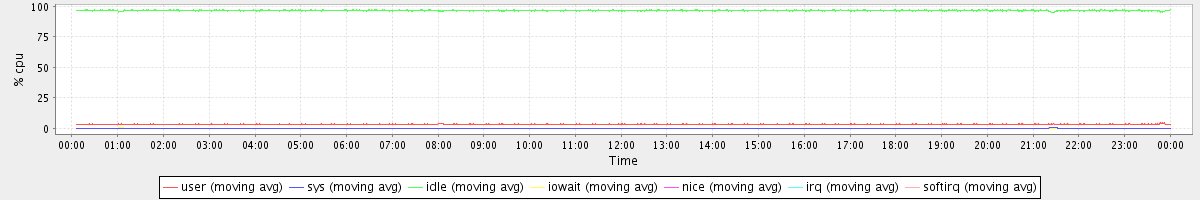 avg(user) = 3.25 avg(sys) = 0.21 avg(idle) = 96.50 avg(iowait) = 0.01 avg(nice) = 0.00 avg(irq) = 0.00 avg(softirq) = 0.00