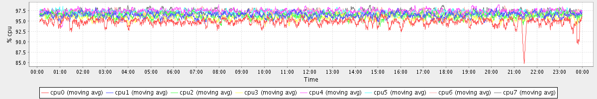 avg(cpu0) = 94.82 avg(cpu1) = 96.44 avg(cpu2) = 96.34 avg(cpu3) = 95.92 avg(cpu4) = 97.33 avg(cpu5) = 96.95 avg(cpu6) = 97.02 avg(cpu7) = 97.19