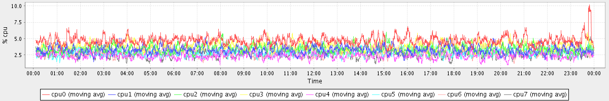 avg(cpu0) = 4.69 avg(cpu1) = 3.26 avg(cpu2) = 3.39 avg(cpu3) = 3.79 avg(cpu4) = 2.42 avg(cpu5) = 2.92 avg(cpu6) = 2.85 avg(cpu7) = 2.70