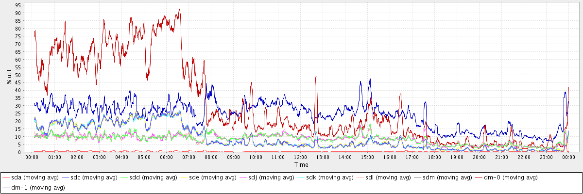 avg(sda) = 0.35 avg(sdc) = 8.64 avg(sdd) = 8.34 avg(sde) = 8.58 avg(sdj) = 8.38 avg(sdk) = 8.55 avg(sdl) = 8.29 avg(sdm) = 8.55 avg(dm-0) = 30.49 avg(dm-1) = 23.97