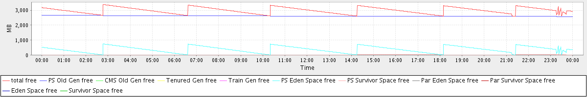 avg(total free) = 2986.31 avg(PS Old Gen free) = 2612.34 avg(CMS Old Gen free) = 0.00 avg(Tenured Gen free) = 0.00 avg(Train Gen free) = 0.00 avg(PS Eden Space free) = 370.32 avg(PS Survivor Space free) = 3.65 avg(Par Eden Space free) = 0.00 avg(Par Survivor Space free) = 0.00 avg(Eden Space free) = 0.00 avg(Survivor Space free) = 0.00