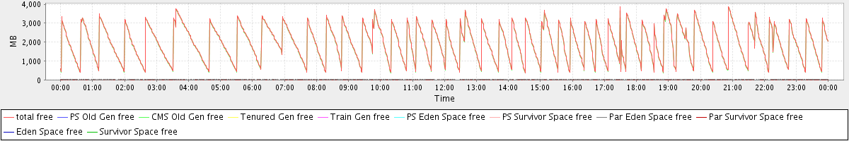 avg(total free) = 1964.17 avg(PS Old Gen free) = 0.00 avg(CMS Old Gen free) = 1943.01 avg(Tenured Gen free) = 0.00 avg(Train Gen free) = 0.00 avg(PS Eden Space free) = 0.00 avg(PS Survivor Space free) = 0.00 avg(Par Eden Space free) = 21.10 avg(Par Survivor Space free) = 0.06 avg(Eden Space free) = 0.00 avg(Survivor Space free) = 0.00