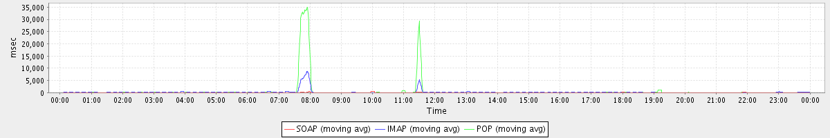 avg(SyncGalRequest) = 6402.86 avg(BackupQueryRequest) = 223.50 avg(GetFreeBusyRequest) = 257.62 avg(AuthRequest) = 479.64 avg(GetQuotaUsageRequest) = 3467.00 avg(ConvActionRequest.delete) = 330.81 avg(AddMsgRequest) = 222.03 avg(SendMsgRequest) = 265.94 avg(BackupRequest) = 19986.50 avg(FolderActionRequest.empty) = 5087.50