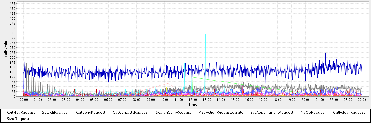 max(GetMsgRequest) = 51.00 max(SearchRequest) = 123.00 max(GetConvRequest) = 98.00 max(GetContactsRequest) = 48.00 max(SearchConvRequest) = 56.00 max(MsgActionRequest.delete) = 464.00 max(SetAppointmentRequest) = 68.00 max(NoOpRequest) = 172.00 max(GetFolderRequest) = 49.00 max(SyncRequest) = 221.00
