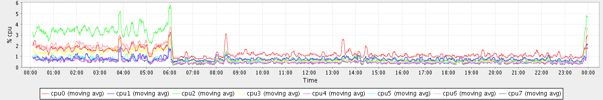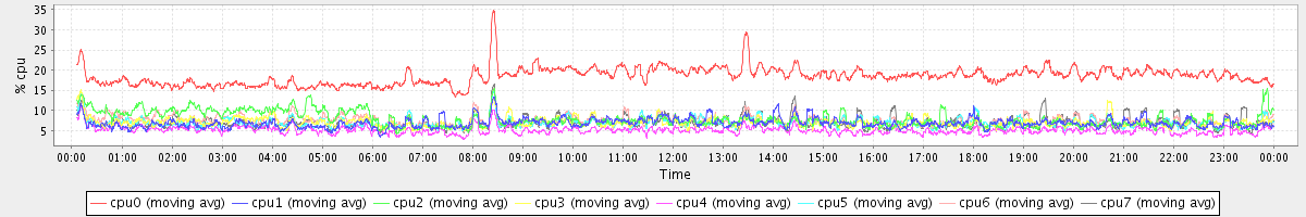 avg(cpu0) = 1.14 avg(cpu1) = 0.11 avg(cpu2) = 0.18 avg(cpu3) = 0.10 avg(cpu4) = 0.05 avg(cpu5) = 0.08 avg(cpu6) = 0.12 avg(cpu7) = 0.07