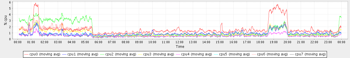 avg(cpu0) = 1.05 avg(cpu1) = 0.14 avg(cpu2) = 0.20 avg(cpu3) = 0.10 avg(cpu4) = 0.07 avg(cpu5) = 0.10 avg(cpu6) = 0.14 avg(cpu7) = 0.09