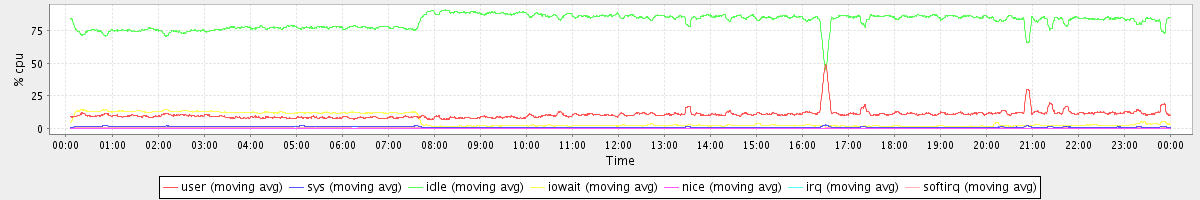 avg(user) = 10.65 avg(sys) = 1.05 avg(idle) = 82.50 avg(iowait) = 5.47 avg(nice) = 0.00 avg(irq) = 0.03 avg(softirq) = 0.30